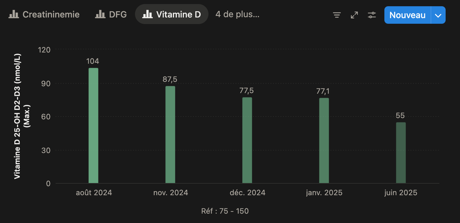 Le suivi sanguin sert à prendre des décisions éclairées. Par exemple, il m'a permis de remettre dans mon protocole de la vitamine D (5000 UI) après un déclin constant suite à mon voyage en Asie :